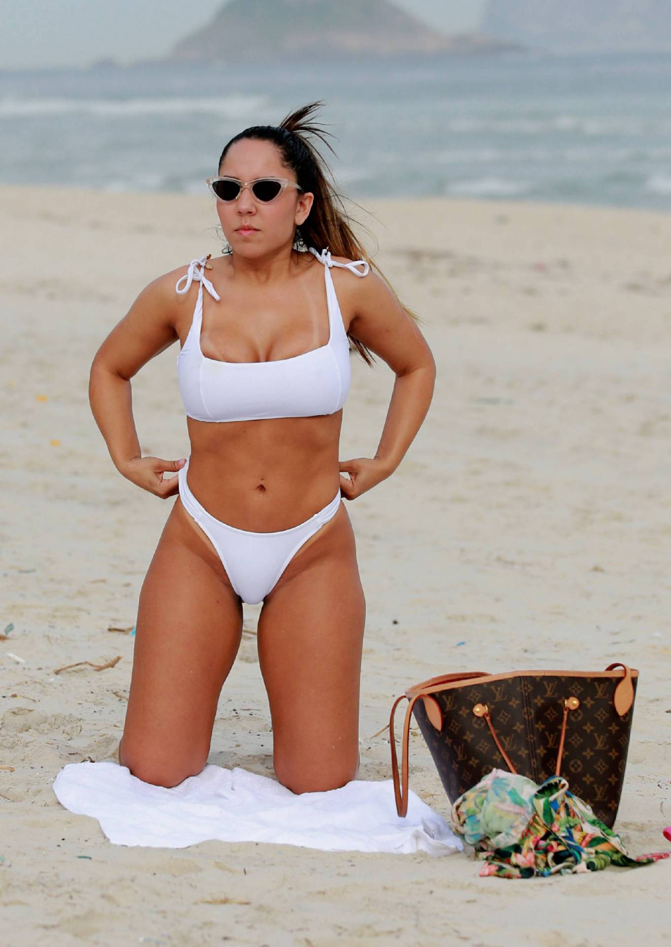Ignorando as autoridades satárias, Renata Frisson foi à praia para garantir a marquinha em dia e tomou sol bem a vontade.