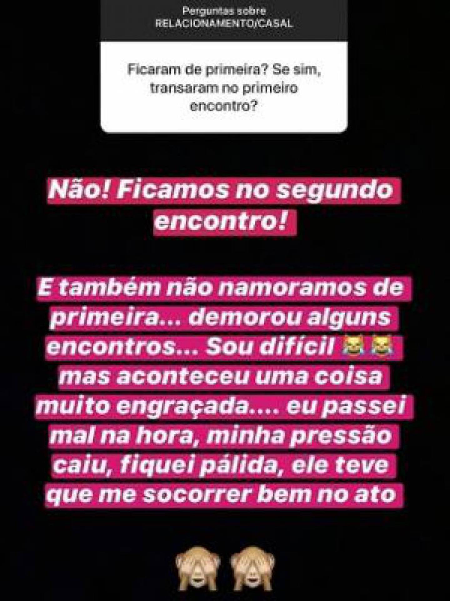 Questionada sobre como foi o início de sua relação com o DJ, a médica disse que eles optaram por levar o relacionamento em modo ‘devagar’ e que só foram ‘ficar mesmo’ no segundo encontro.
