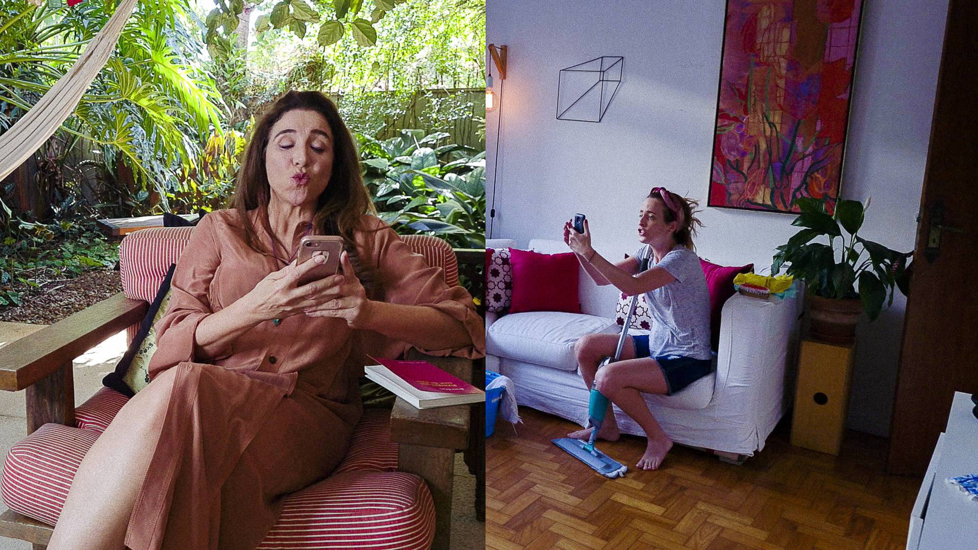 "Olha, tá saindo bem bom, sabia? O mais incrível tem sido o trabalho dos roteiristas que tiveram que criar cenas a partir de fotos das nossas casas. Aproveito o fato de morar num local silencioso e com bastante luz. Isso ajuda muito", inicia ela, contando que colocou todo mundo da casa para trabalhar.