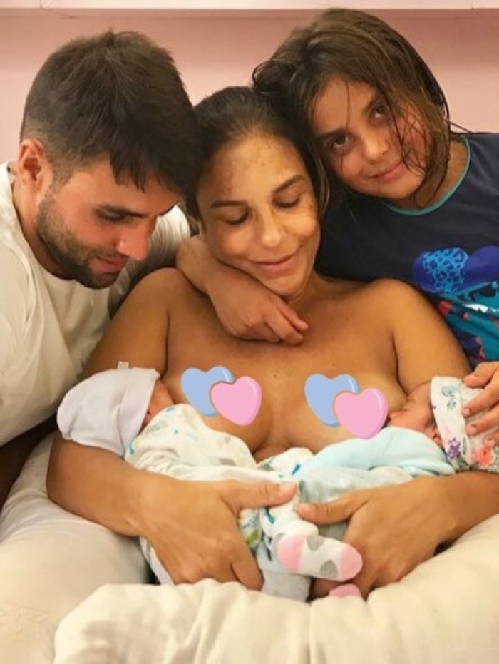 "Bom dia, zamurinhos! Quanta saudade de vocês e dos nossos encontros. Mas, confesso que estou no mais pleno momento da minha vida! Minha família linda cresceu e estamos tão felizes que não cabe no nosso coração esse amor gigante. Mando essa foto para matar a saudade e dizer que ficarei um pouquinho mais ausente das redes sociais em função da grande atenção que eles precisam nesse momento. A amamentação é uma das coisas mais prazerosas e saudáveis para elas e para mim. Elas crescem felizes e bem alimentadas", escreveu na legenda da foto.