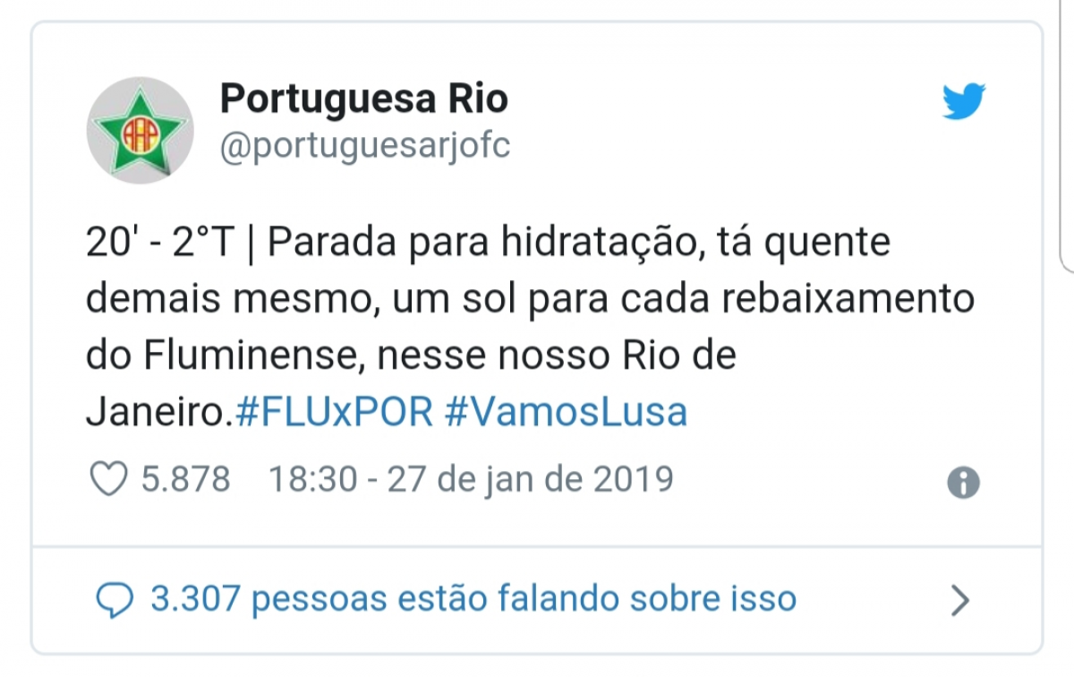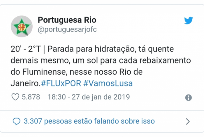 Rio - A Portuguesa perdeu do Fluminense por 3 a 1, neste domingo, no Maracanã. Mas saiu de campo com o troféu da zoação. Durante a partida, o Twitter do clube da Ilha ironizou os rebaixamentos tricolores ao comentar o calor carioca.