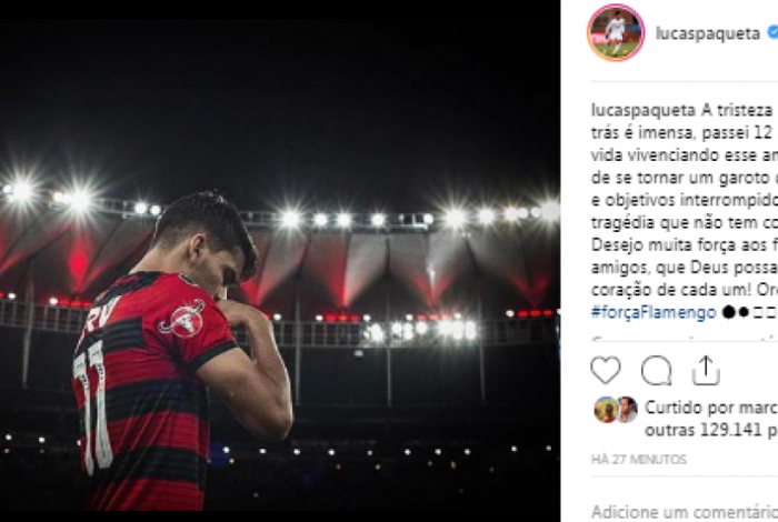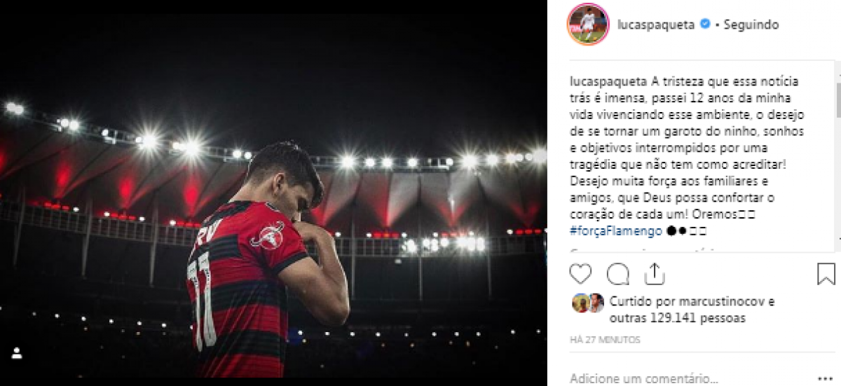 Revelados na base do Flamengo, Vinícius Jr. e Lucas Paquetá se manifestaram sobre a tragédia no Ninho do Urubu. O atacante do Real Madrid deu apoio aos familiares: "Que notícia triste, ainda sem acreditar... Oremos por todos! Força, força e força aos familiares dos jovens sonhadores que estavam presente no CT do Flamengo!".