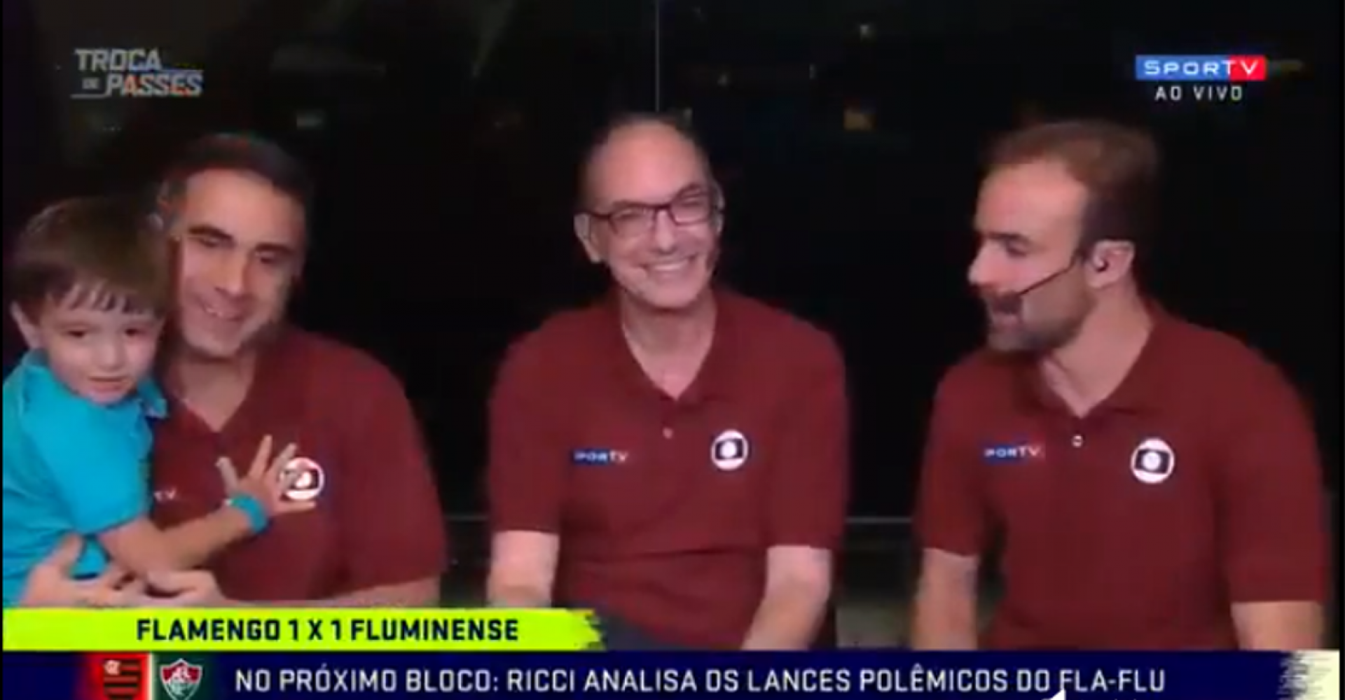 A transmissão ao vivo do programa "Troca de Passes" do SporTV, emissora esportiva do grupo Globo, foi marcada por um momento pra lá de fofo. É que o filho de Gustavo Villani acabou invadindo a cabine onde estava narrando a partida entre Flamengo e Fluminense, neste sábado, no Maracanã, e pulou no colo do pai. A atitude do menino deixou todo mundo surpreso.
