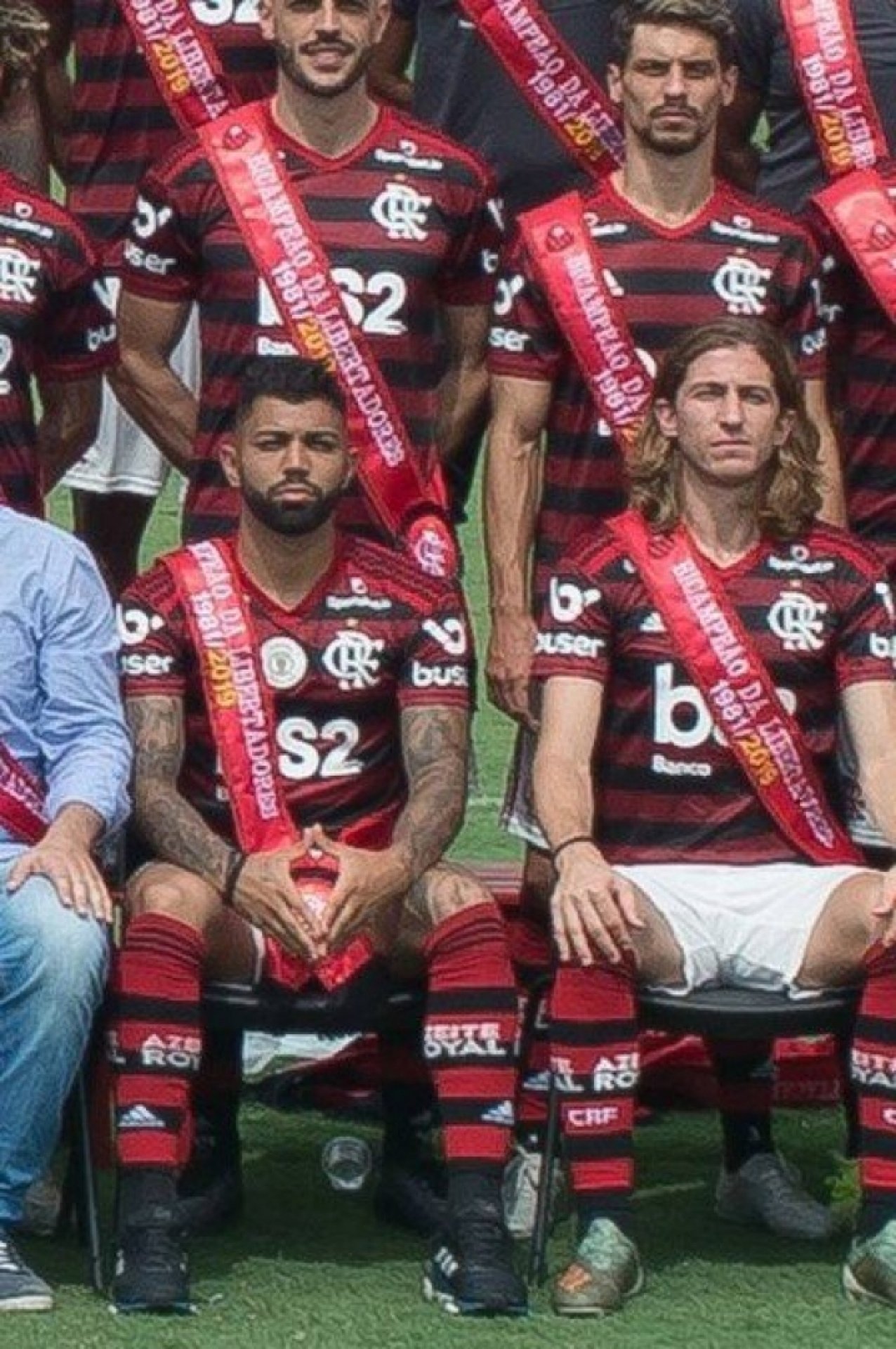 O FLAMENGO divulgou ontem a foto oficial das conquistas da Libertadores e do Brasileiro. Jogadores, comissão técnica e diretoria posaram com as faixas de campeão, mas o fato que chamou a atenção foi o gesto de Gabigol. O atacante imitou Neymar e Ronaldinho, quando estavam no Barcelona, e fizeram um sinal, digamos, polêmico com as mãos.
