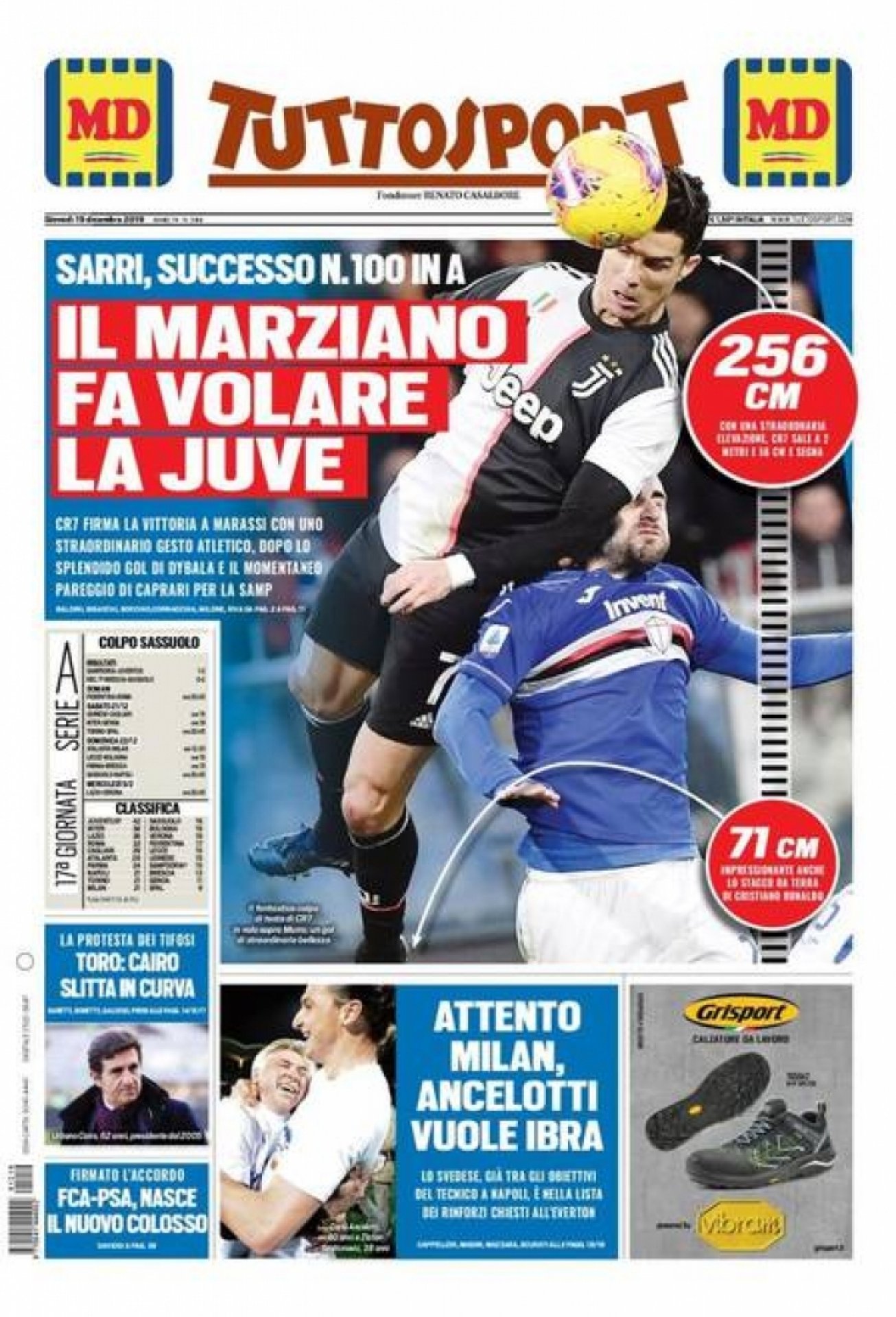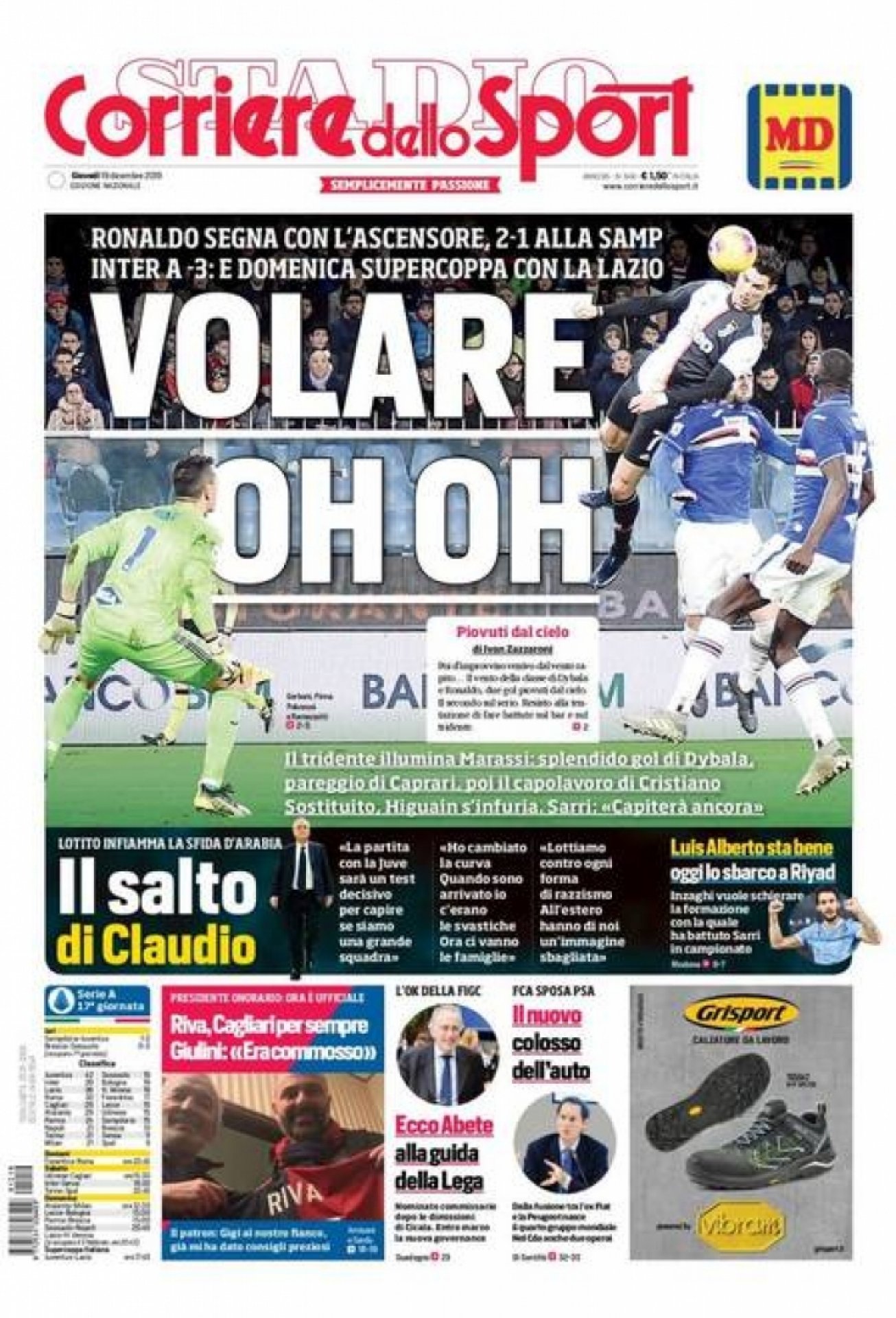 O "voo" de Cristiano Ronaldo para marcar o gol da vitória no confronto entre Juventus e Sampdoria ganhou as capas de jornais ao redor do mundo nesta quinta-feira. O gol de cabeça do astro português selou o triunfo por 2 a 1 dos líderes do Campeonato Italiano, porém repercutiu devido aos números impressionantes alcançados pelo atacante no salto. O artilheiro chegou a 2,56 metros de altura, saiu 72 cm do chão e ficou parado no ar por um segundo antes da conclusão da jogada. "Uma cabeçada que desafia a gravidade", foi a definição dada pelo diário britânico "Daily Mail".
