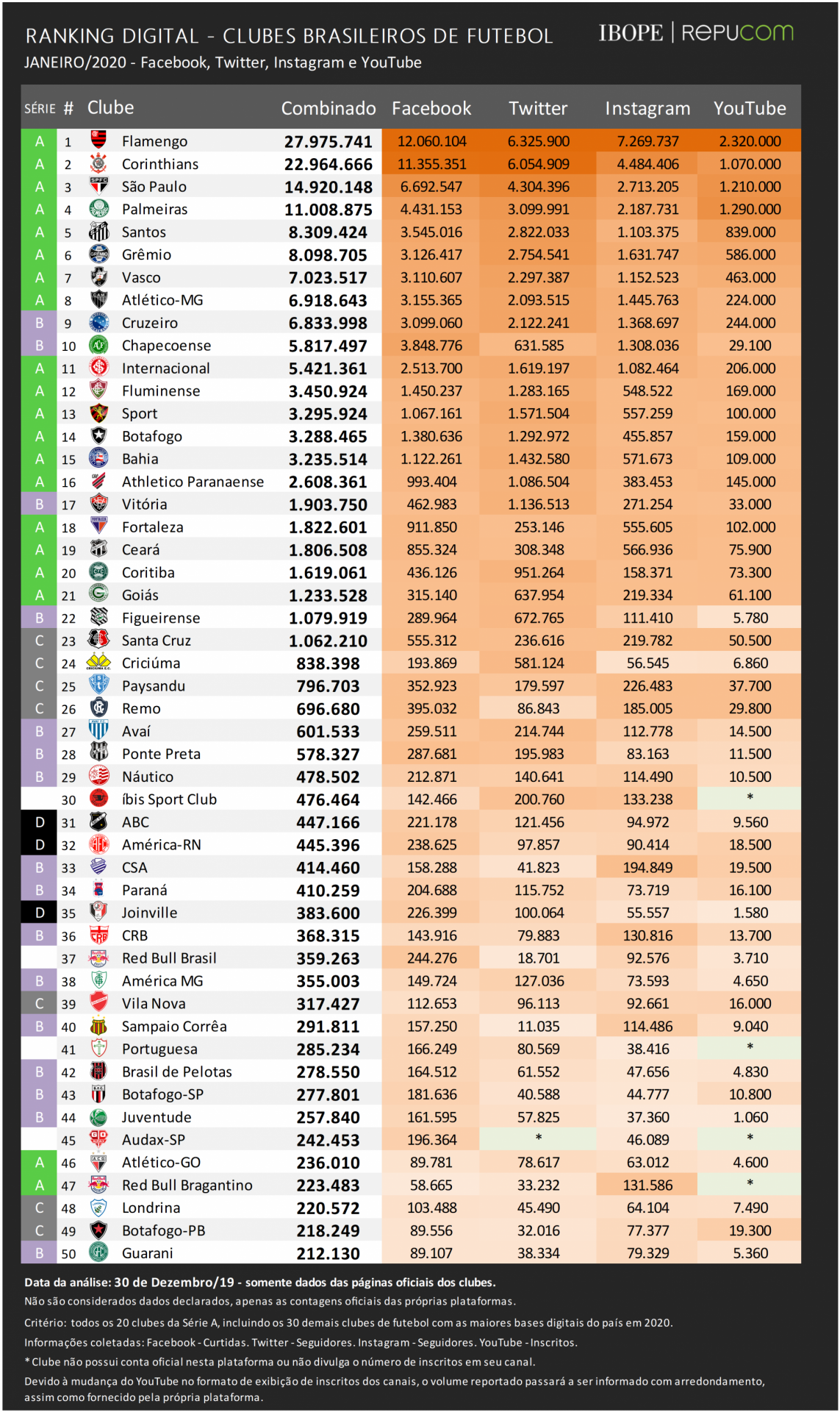 Nesta quarta-feira, o Ibope/Repucom publicou o ranking digital dos clubes brasileiros. Líder do levantamento, o Flamengo fechou o 2019 marcado pela conquista do Brasileirão e da Libertadores com uma distância ainda maior para os rivais, e se consolida a cada ano que passa como a equipe com mais seguidores do país.