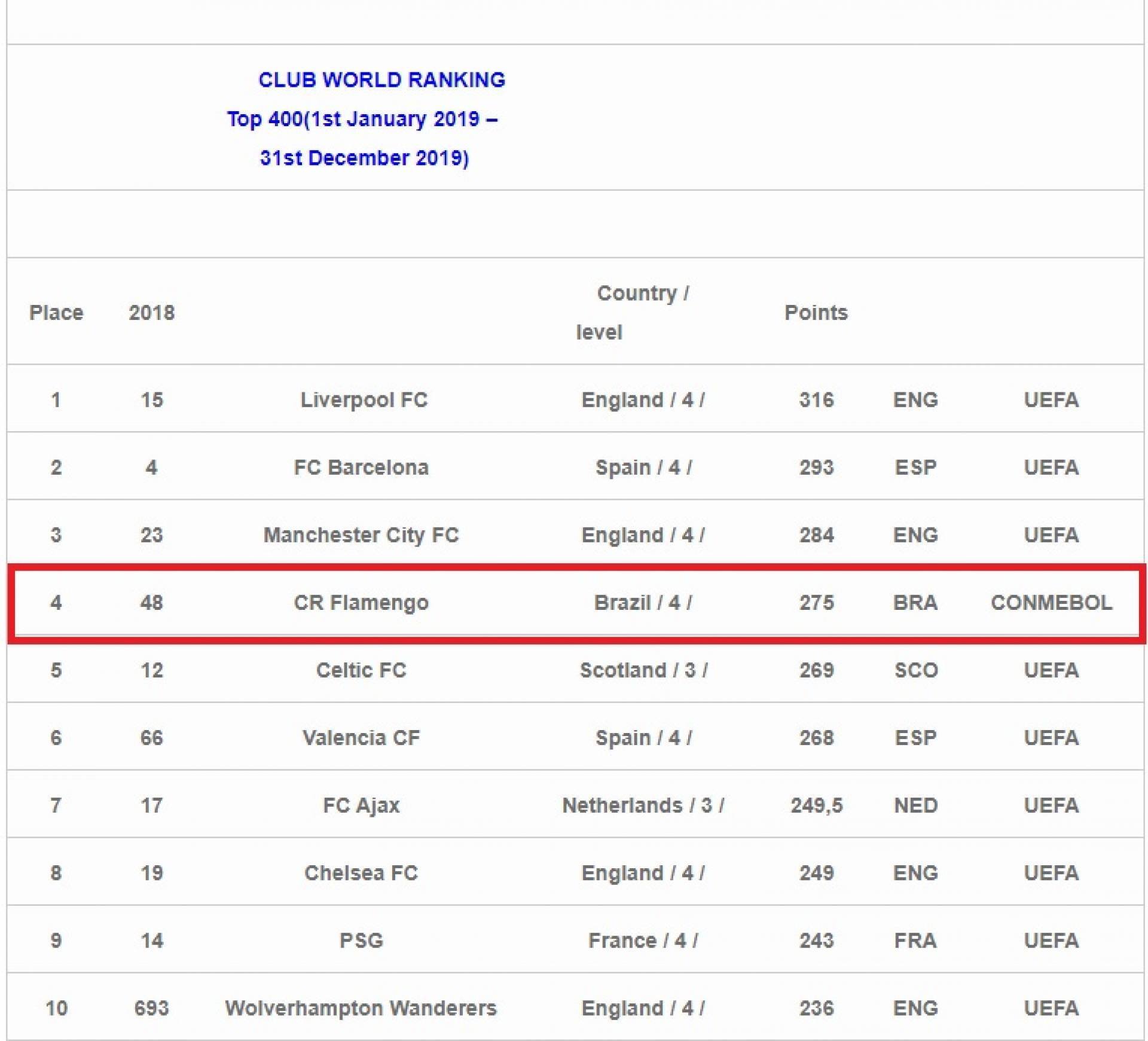 O Rubro-Negro ganhou uma posição em relação à última lista, ultrapassando o Valência-ESP. Agora, a equipe de Jorge Jesus está atrás apenas de Liverpool, Barcelona e Manchester City.