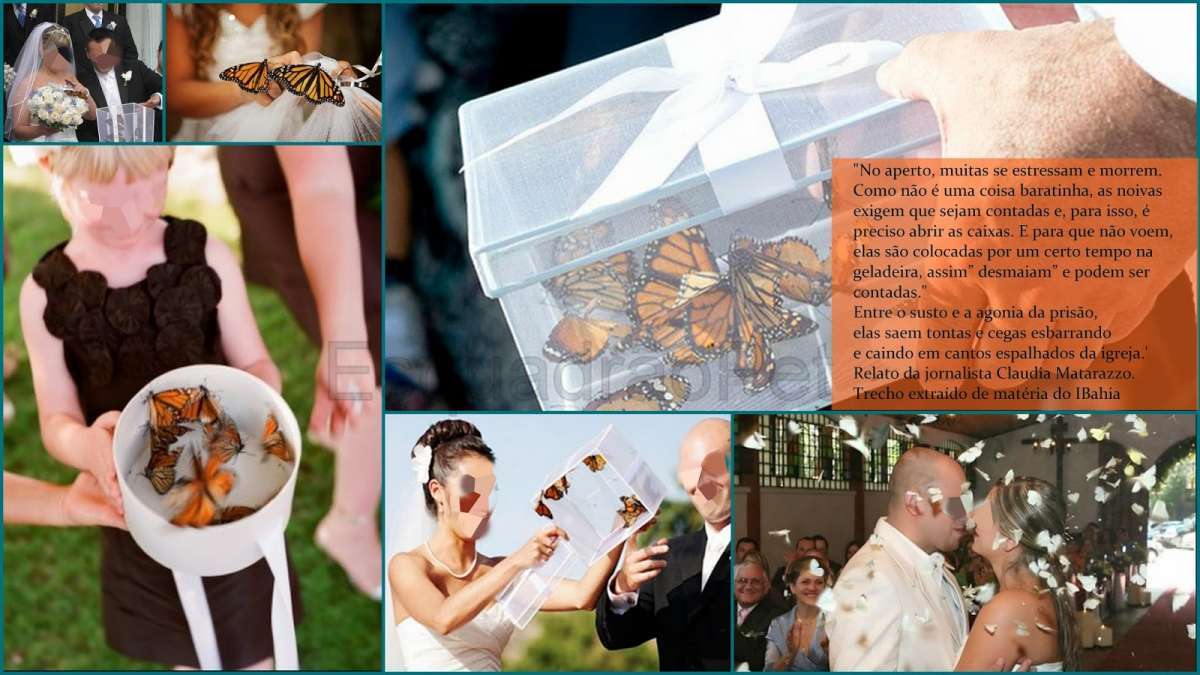 Uma moda importada dos Estados Unidos vem mostrando que a crueldade humana não tem limites: borboletas estão sendo congeladas para, durante casamentos, serem "devolvidas à vida" e embelezar as cerimônias. Mas os voos duram pouco: os bichinhos, de tão estressados e fracos, acabam morrendo logo.