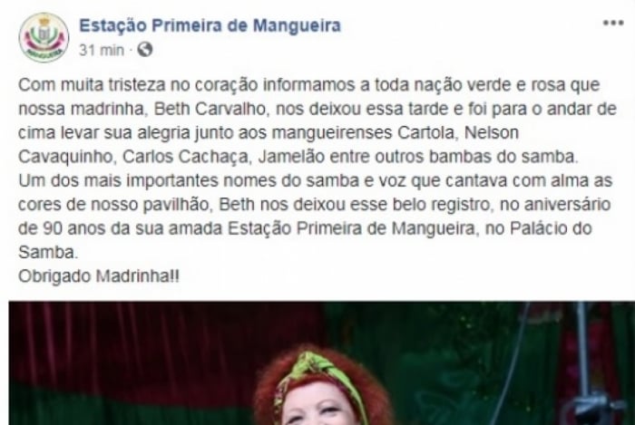A Mangueira homenageou na noite desta terça-feira, no Instagram, uma de suas torcedoras mais ilustres: Beth Carvalho, que morreu aos 72 anos.
