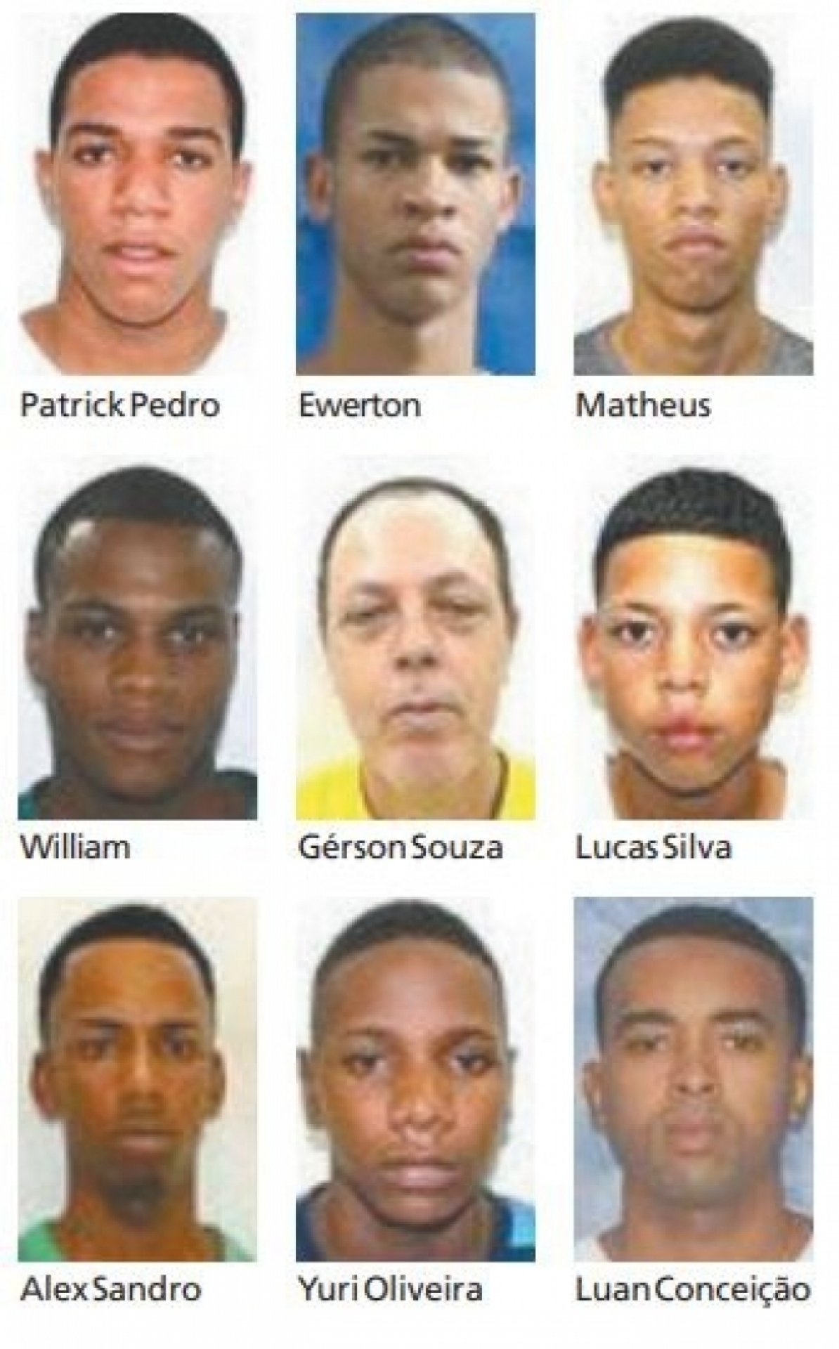 Já estão presos Ewerton Furtado Cândido, o motorista da quadrilha; Matheus Maciel da Silva, William Marques Abrahão, Alex Sandro Sá Pedro e Luan Miguel da Conceição. Os foragidos são Patrick Pedro Paraíso, Gerson Souza de Oliveira e Lucas Silva Moraes.