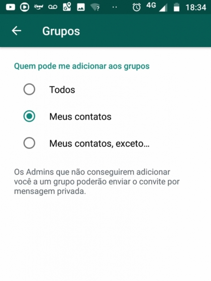 São três níveis de privacidade. O primeiro mantém tudo como está. Qualquer um pode adicionar sem pedir permissão. O segundo permite que apenas contatos adicionem. O terceiro permite que contatos, exceto alguns, determinados pelo usuário, podem adicionar. Os administradores de grupos bloqueados poderão enviar convite por conversa individual com validade de três dias.