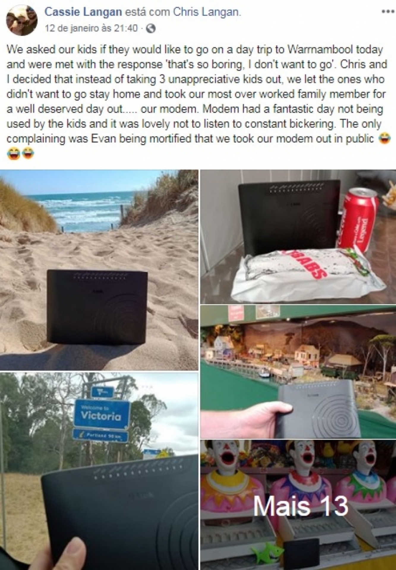 "Quando chegamos em casa, nossos filhos estavam tão entediados que a mais velha limpou o quarto e passou um tempo com seu irmão mais novo. Quando mostrei as fotos, meu filho de 10 anos disse que não era justo, que amávamos mais o modem do que ele e foi pro seu dele", contou.