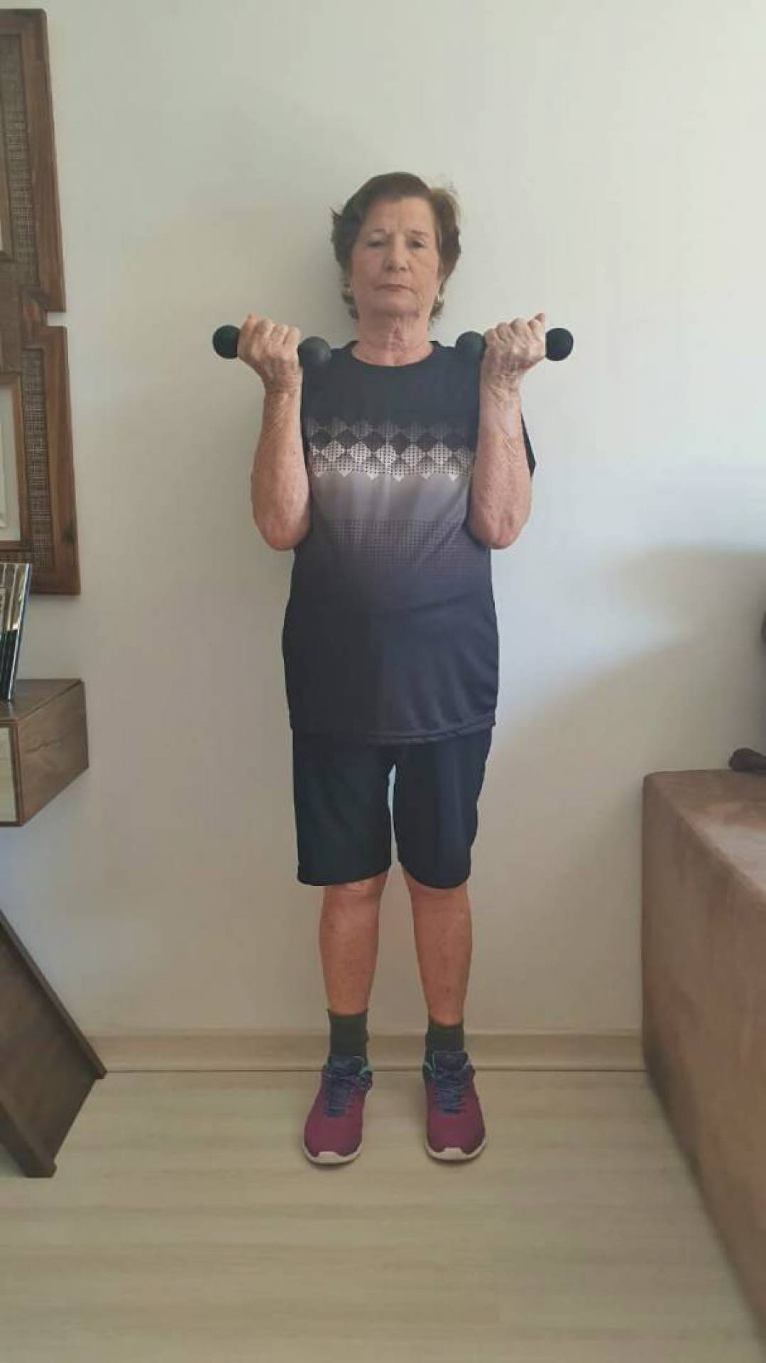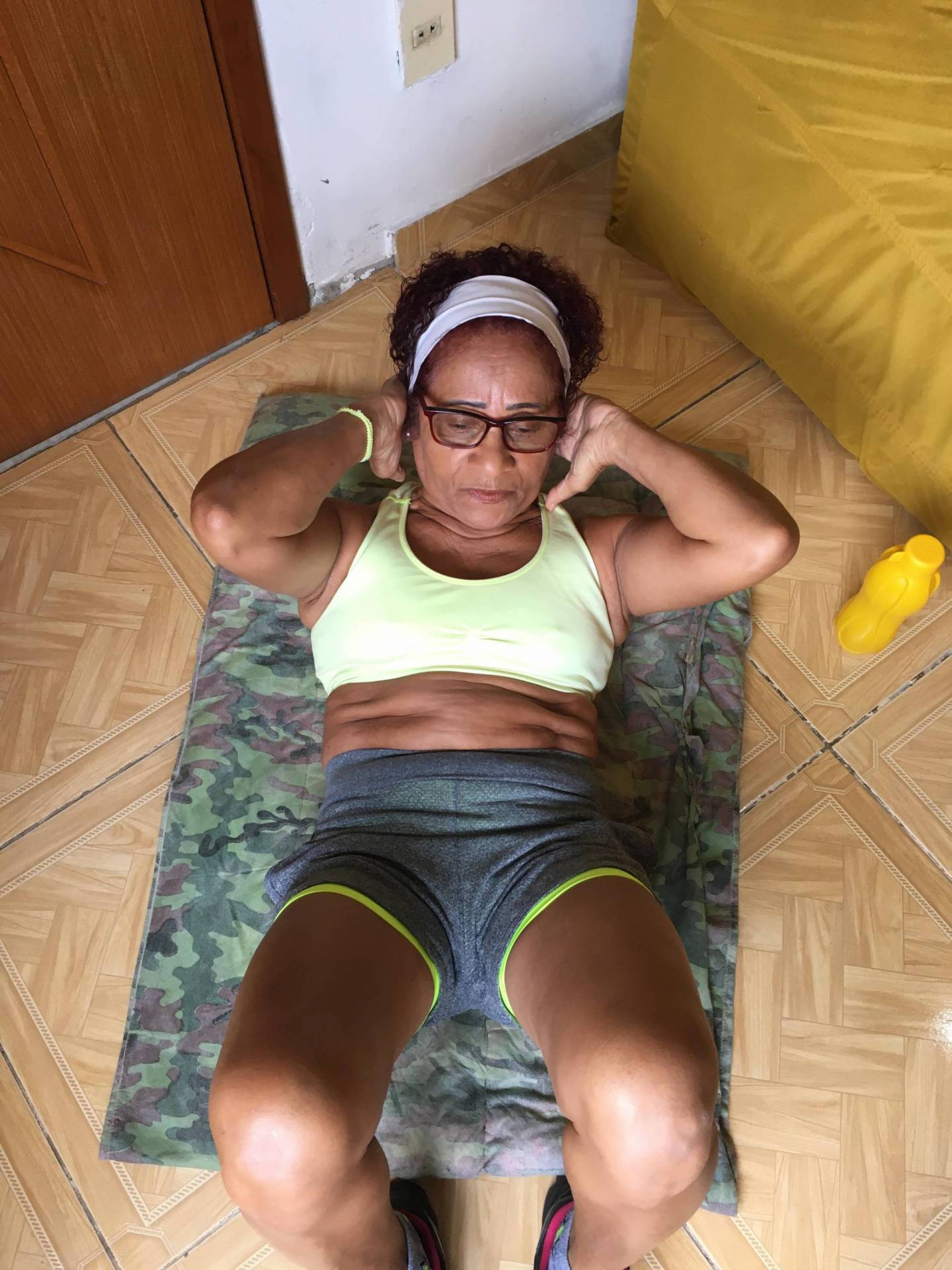 Sem perder o pique, Vera Lucia Serino dos Santos, de 72 anos, faz sua série na sala de casa. "Faço exercício há algum tempo e, devido a pandemia, continuo em casa. É muito bom pra gente na terceira idade, Me faz bem", conta ela.