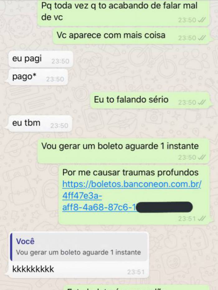 “Fazendo meu ex pagar as sessões de terapia que gastei falando mal dele”, escreveu Milena no Twitter ao compartilhar um print screen de uma conversa no WhatsApp. Na troca de mensagens, ela aparece enviando um boleto e brinca dizendo pro ex: “esse é o seu perdão”. Como resposta, o rapaz dá risada, mas envia o que parece ser um comprovante de pagamento.