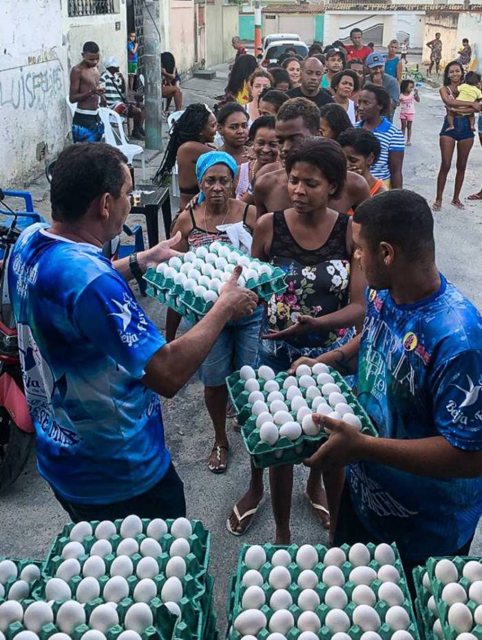 Já foram doadas mais de mil caixas de biscoitos, água e guaraná natural, além de mil caixas de ovos. Também foram confeccionadas unidades de protetores faciais transparentes, destinadas ao Hospital Pedro Ernesto, no Rio, e para unidades hospitalares em Nilópolis. Realizada no auge da pandemia, a Live do Samba, que teve participações de seis escolas, arrecadou 60 toneladas de alimentos, 700 litros de água e 3500 máscaras.