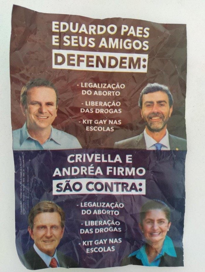 Panfletos distribuídos pela campanha de Marcelo Crivella (Republicanos) afirmam que Eduardo Paes (DEM), adversário do prefeito no segundo turno, e o deputado federal Marcelo Freixo (PSOL) estariam juntos na campanha pela defesa do aborto, da legalização das drogas e do 'kit gay' nas escolas. Furiosos com as mentiras divulgadas no texto, Paes e Freixo foram às redes sociais desmentir os boatos.