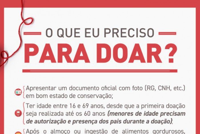 È necessário levar documento original com foto, dormir pelo menos 6 horas na noite anterior, não é necessário estar em jejum e não fazer uso de bebida alcoólica nas 12 horas que anteceda, a doação.