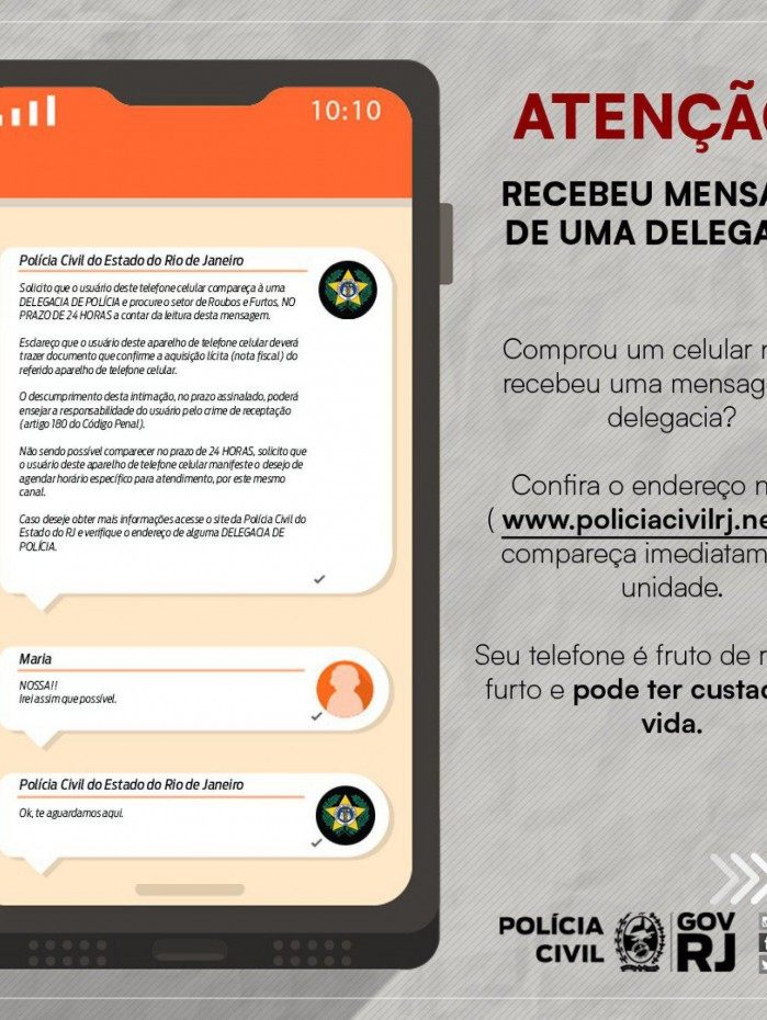 "Solicito que o usuário deste telefone celular compareça à 52 DELEGACIA DE POLÍCIA (NOVA IGUAÇU) e procure o setor de Roubos e Furtos, NO PRAZO DE 24 HORAS a contar da leitura desta mensagem.