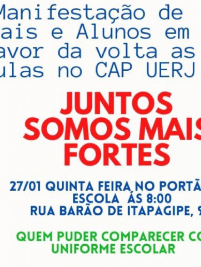 "Queremos que o direito dos nossos filhos seja respeitado! Já são dois anos sem aulas presenciais no CAp UERJ, uma das principais Instituições públicas de educação nesse país. O CAp UERJ vem deixando crianças e adolescentes completamente desamparados e psicologicamente doentes. Transfere a responsabilidade do ensino das crianças aos responsáveis. Deixa os adolescentes do ensino médio despreparados para o Enem", diz uma nota divulgada pelo grupo.