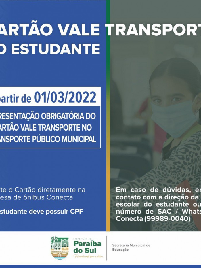 Paraíba do Sul - A Secretaria Municipal de Educação de Paraíba do Sul informa que a partir do dia 1º de março os estudantes da Rede Municipal de Ensino deverão apresentar, obrigatoriamente, o Cartão Vale Transporte para acessarem de forma gratuita o transporte público municipal durante o trajeto escolar.