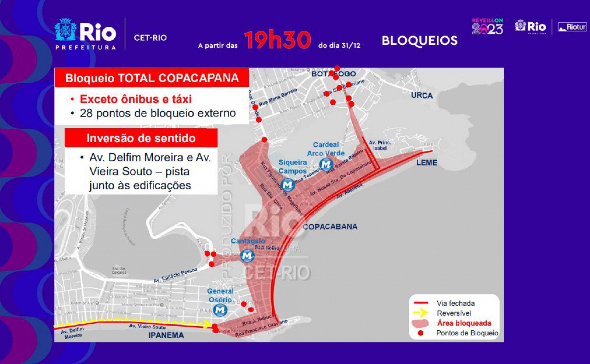 – Vieira Souto, em ambos os lados, em ambos os sentidos, inclusive nas baias do canteiro central (exceto para ônibus linhas regulares, das 22h do dia 31/12 às 5h do dia 1/1).