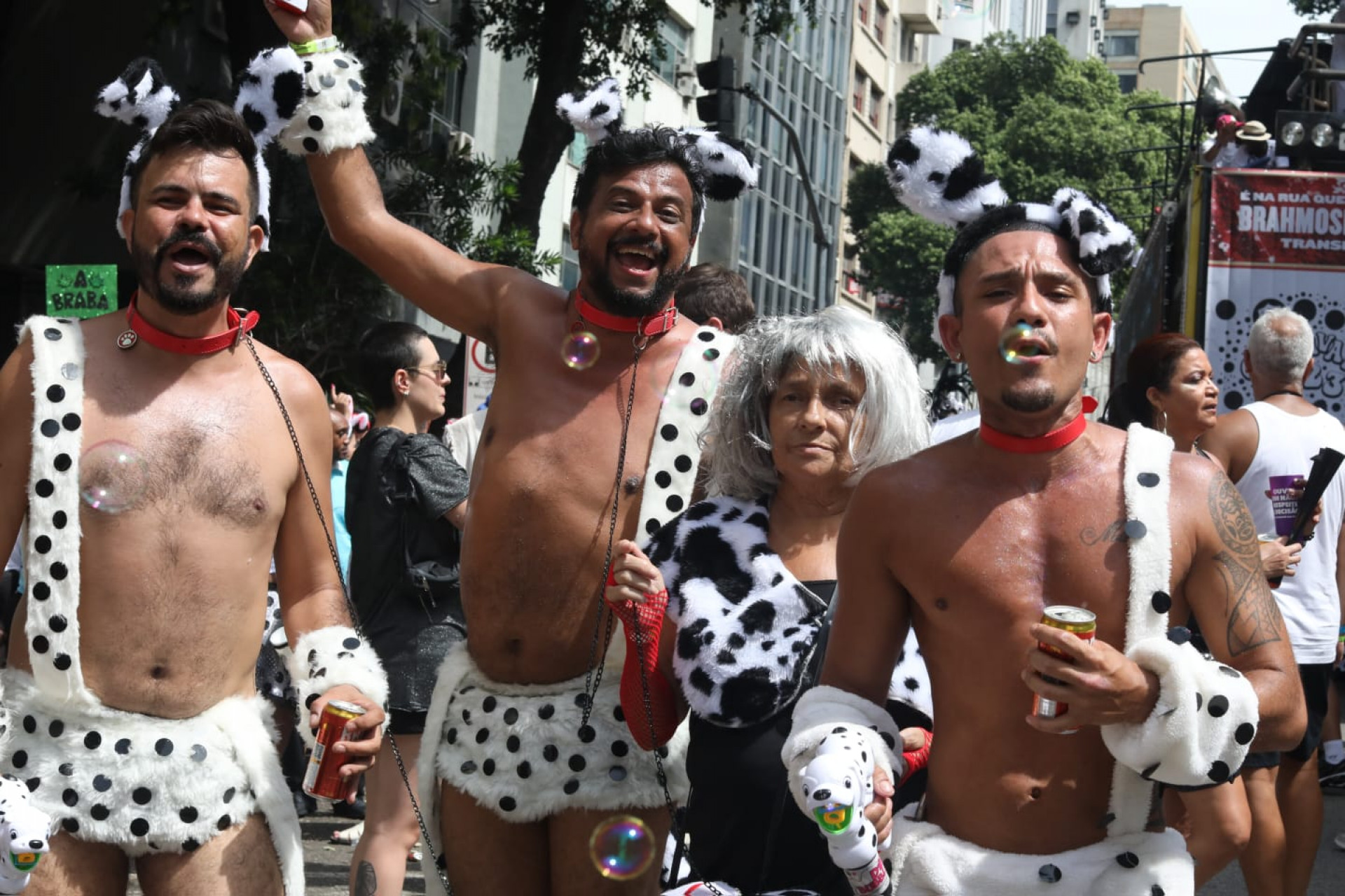 Com fantasias inspiradas nos prêmios do Grammy Latino da cantora Maria Rita, a enfermeira Regiane Finamore, 26 anos; as profissionais de marketing Patrícia Oliver, 21, e Ariane Machado, 24; além da bióloga Tainá Amorim, 23, todas amigas, se divertiram no meio da multidão.
