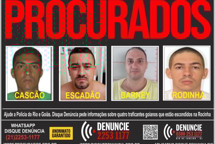 Rio - O Disque Denúncia (2253-1177) divulgou, nesta quinta-feira (5), um cartaz em busca de informações sobre quatro traficantes do estado de Goiás que estariam escondidos na Rocinha, Zona Sul do Rio.