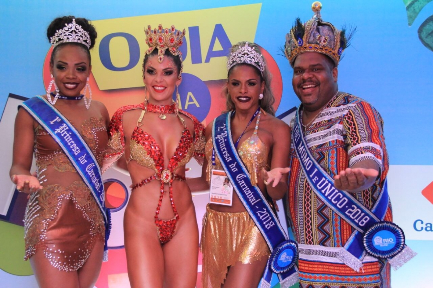 Elaine Azevedo (Estácio de Sá), Larissa Nicolau (Santa Cruz) e Raissa Machado (Viradouro) foram as Rainhas de Bateria que brilharam na Série A. Deslumbrante na Avenida, Elaine exibiu um corpo estilo Sabrina Sato numa roupa vermelha confeccionada por Guilherme Alves. A Rainha ainda teve gás para se destacar no posto de musa do camarote do jornal O Dia na Sapucaí (na foto, ela posa com o Rei Momo e as duas princesas do Carnaval). A novinha Larissa Nicolau (de preto) e Raissa Machado (de azul) também deram show na Avenida. As duas usaram roupas confeccionadas pelo estilista Michel Marssola.