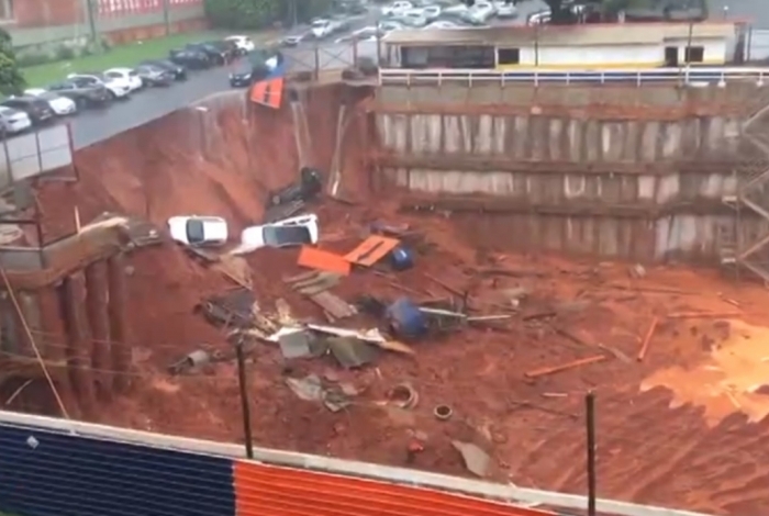 Um enorme buraco, onde funcionava um canteiro de obras, se expandiu na tarde de ontem, em Brasília (DF), após uma forte chuva que atingiu a região. Quatro carros foram parar dentro da cratera, de 10 metros de profundidade, quando o asfalto cedeu. Ninguém ficou ferido. A área foi interditada.