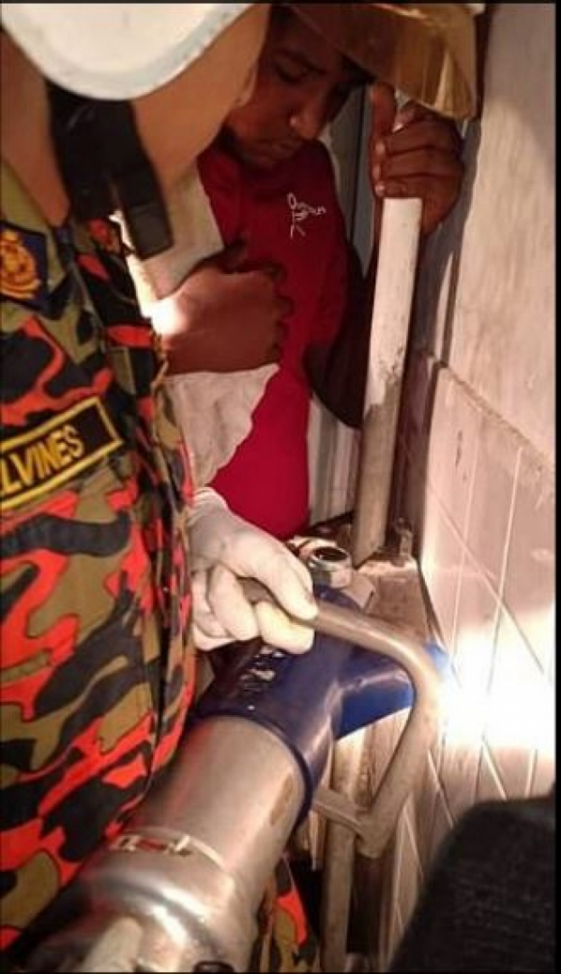 Os bombeiros atenderam a um chamado de emergência e foram ao local. A princípio, imaginam que uma serra manual daria conta do serviço, mas se enganaram. Foi preciso uma serra elétrica circular para cortar o cano que prendia o rapaz com a tenacidade de uma noiva apaixonada. Os bombeiros cortaram o cano da parede e levaram o adolescente para o hospital, onde o resto do aparato metálico foi removido.