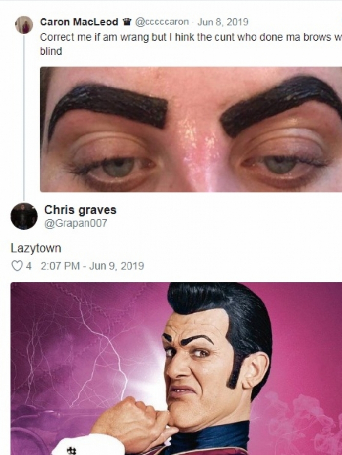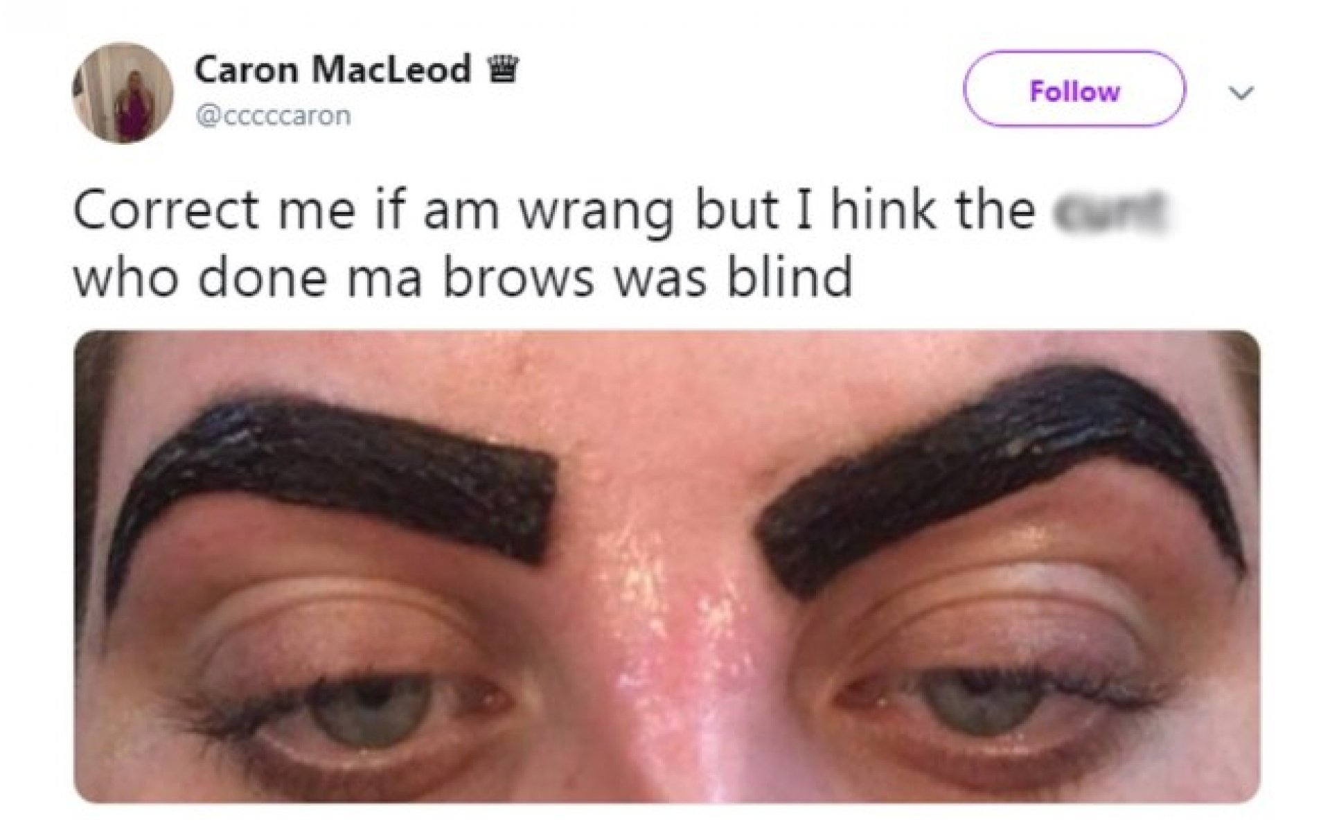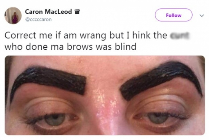 Ela compartilhou a foto das sobrancelhas ainda com a tinta no Twitter: "Me corrijam se eu estiver errada, mas acho que a **** que fez minha sobrancelha era cega". Além de perceber que a cor da tinta ainda está super escura, é possível ver que um dos desenhos está bastante diferente do outro (além de estar torto).