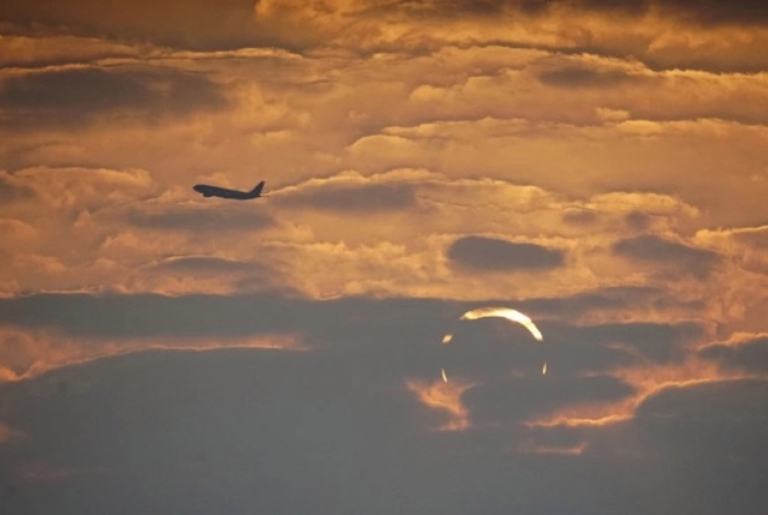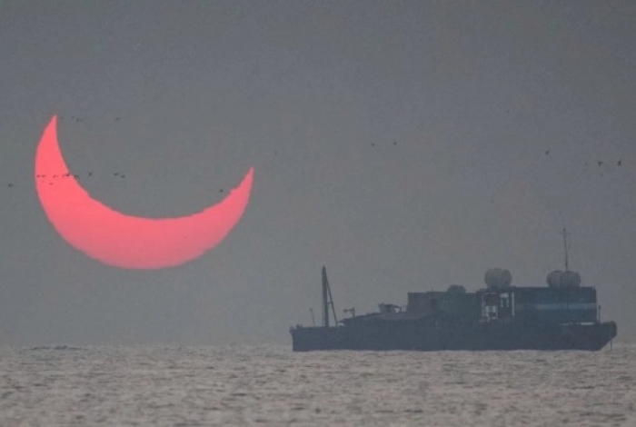 Elias Chasiotis estava no Golfo Pérsico e planejava capturar o eclipse solar em Al Wakrah, no Catar, quando foi surpreendido. O fotografo viajou para acompanhar o raro espetáculo do Sol que, parcialmente, bloqueava a Lua ao amanhecer perto da superfície do oceano.