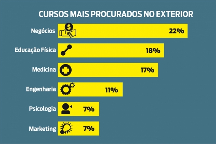 Ainda de acordo com a pesquisa da agência, entre as graduações mais desejadas no exterior estão: Negócios (22%), Educação Física (18%), Medicina (17%), Engenharia (11%), Psicologia e Marketing (7%). O cenário nacional é diferente. Segundo o MEC, Direito e Administração ocupam o topo da lista de carreiras mais cursadas no país.