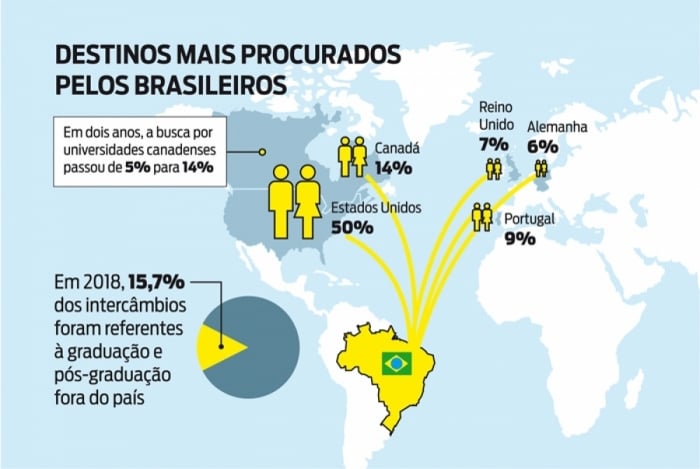 Segundo a CI Intercâmbio e Viagem, os destinos mais procurados em 2018 por brasileiros foram: Estados Unidos (50%), Canadá (14%), Portugal (9%), Reino Unido (7%) e Alemanha (6%). Destaque para as universidades canadenses, que em 2017 interessava apenas 5% dos brasileiros. "Outros países ganharam relevância nas buscas, como Itália, Holanda, Austrália, Argentina e França", diz Humberto Costa, diretor da CI.