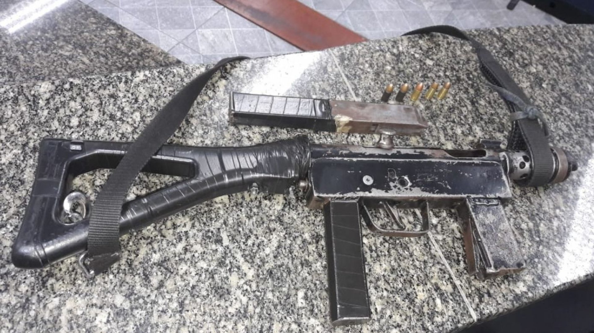 Uma submetralhadora com um carregador e cinco munições foram apreendidos no local.