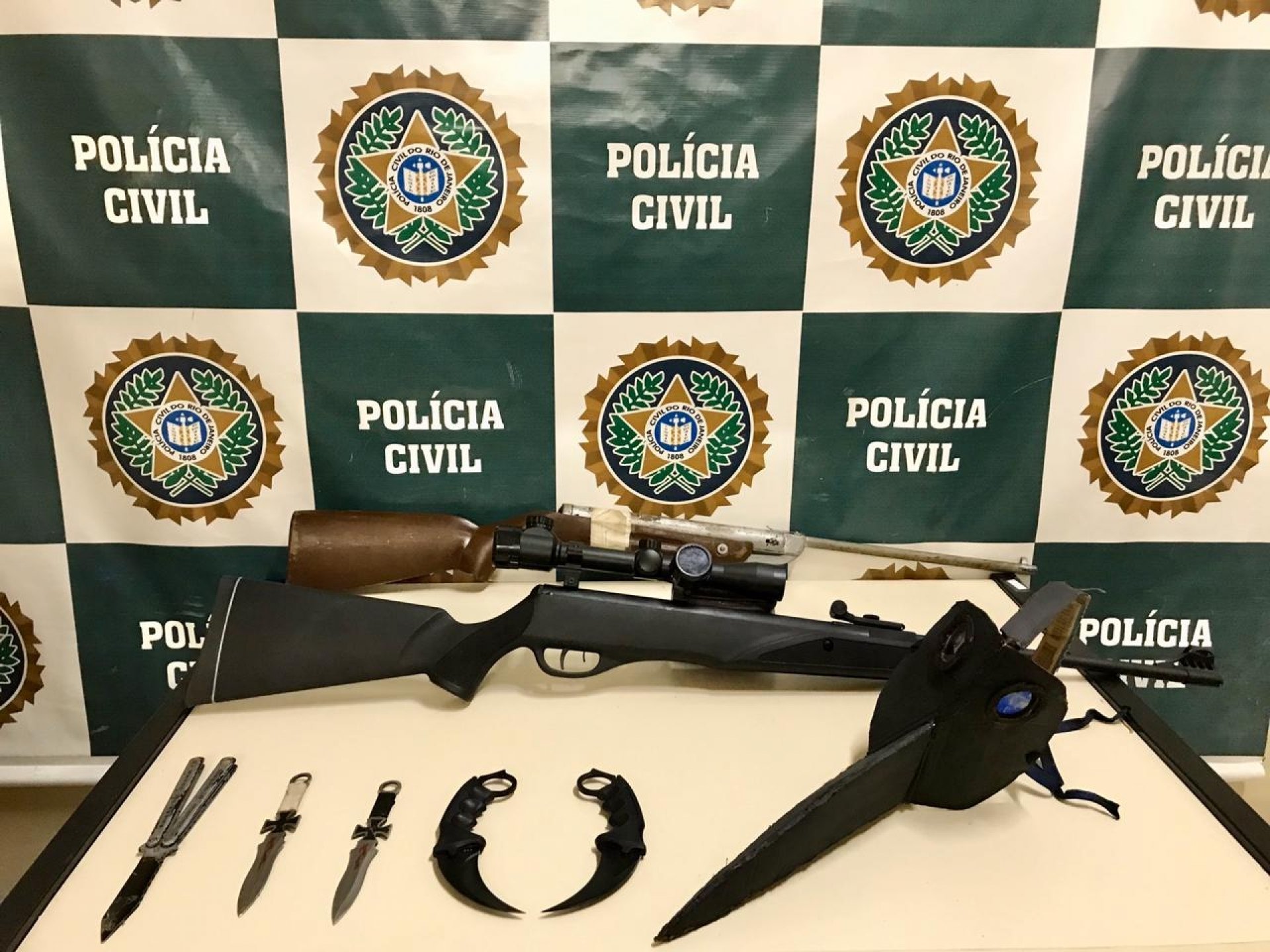 Na casa de Leonam Polo Gomes da Silva Rosa os policiais apreenderam réplicas de espingarda, punhais e uma máscara usada por ele nos vídeos.