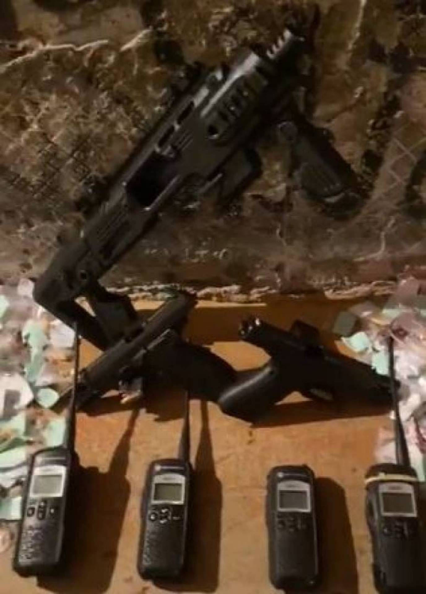 Segundo a PM, junto com os suspeitos, foram apreendidos duas pistolas com munições, um kit Roni, rádios e drogas.