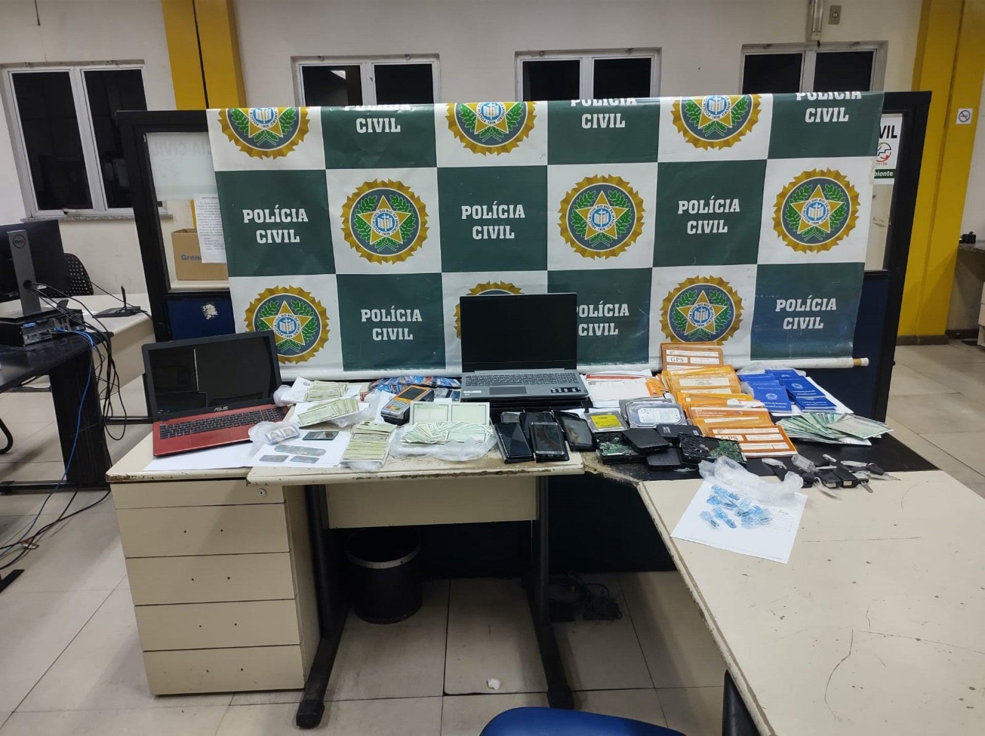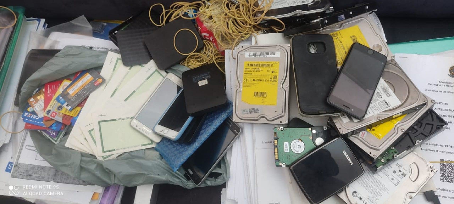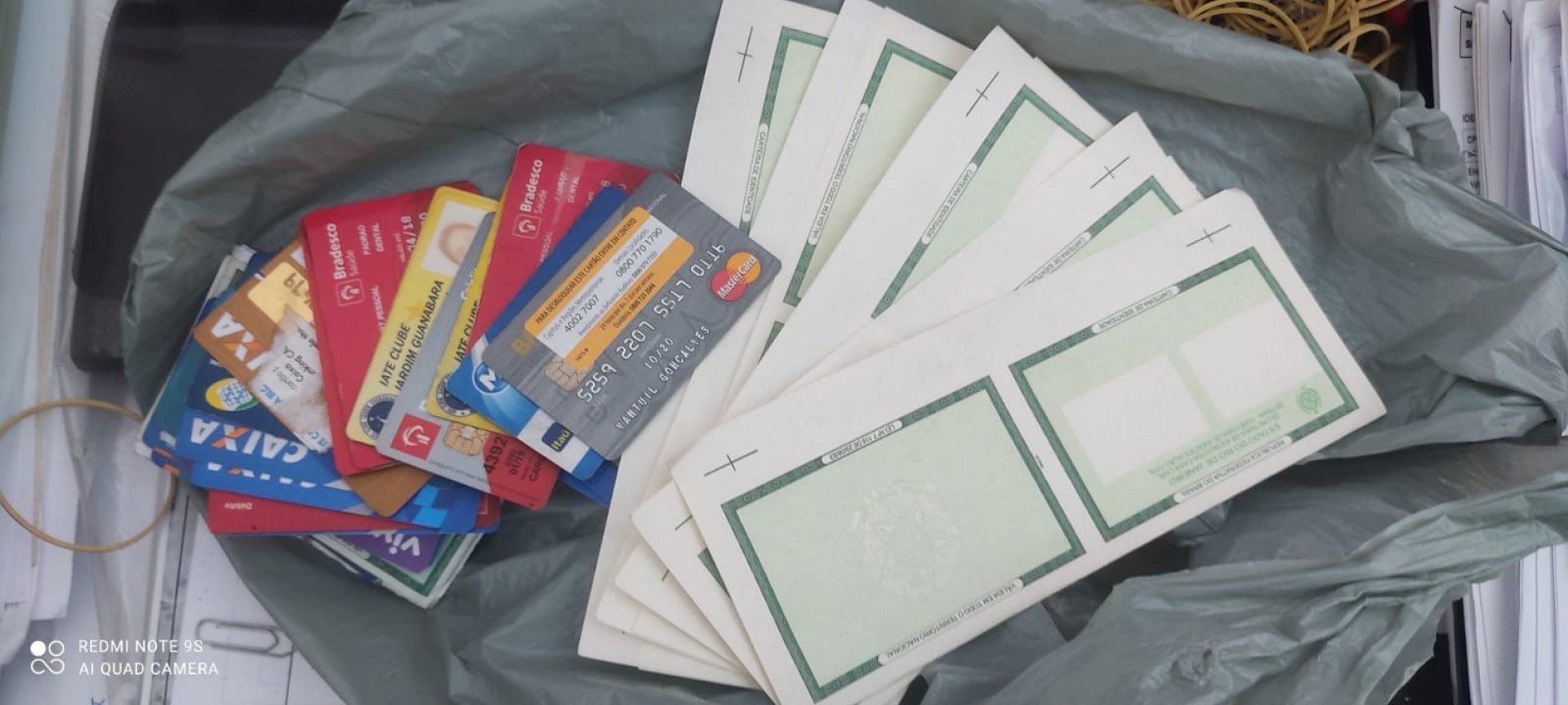 Na casa dele, foram apreendidos telefones celulares, carteiras de trabalho, lacres plásticos do Detran, fotos, placas metálicas utilizadas na falsificação de identidades, diversos documentos em nome de terceiros, cheques, cartões bancários, além de chaves e documentações de veículos.