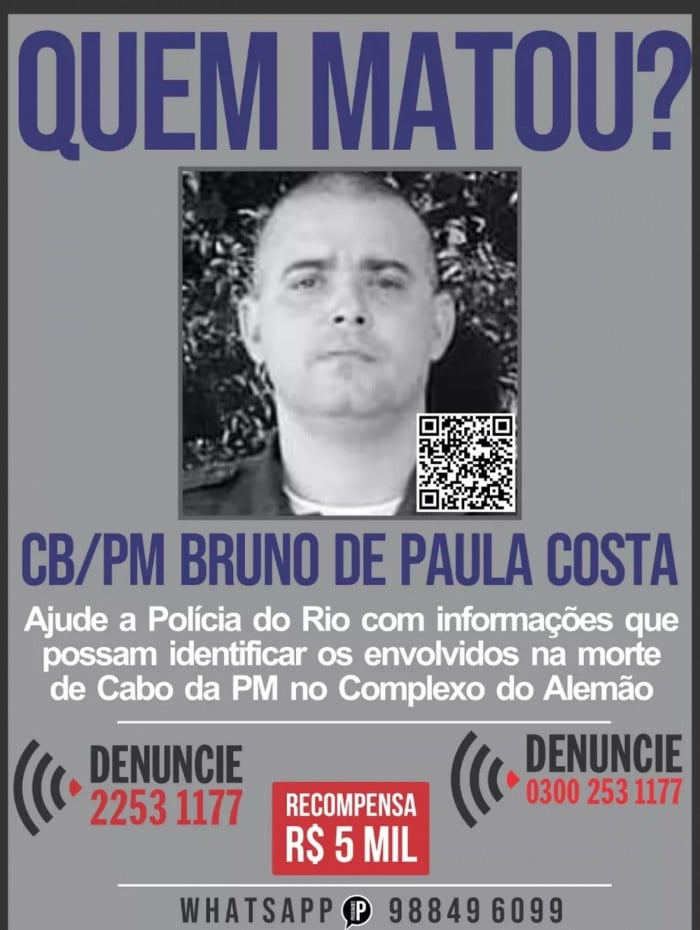 Rio - A Polícia Civil divulgou, nesta quinta-feira (21), um cartaz pedindo informações sobre os envolvidos na morte do cabo da Polícia Militar Bruno de Paula Costa, de 38 anos, no Complexo do Alemão, Zona Norte do Rio. O agente estava trabalhando e ficou ferido quando a base da UPP de Nova Brasília foi atacada por criminosos em retaliação à operação na comunidade. Ele chegou a ser socorrido ao Hospital Estadual Getúlio Vargas, na Penha, mas não resistiu aos ferimentos e morreu. Bruno estava na corporação desde 2014. Ele deixa esposa e dois filhos autistas.