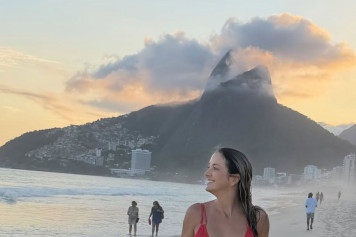 'OLHA, QUE COISA MAIS LINDA...' Filha da 'Garota de Ipanema', Ticiane Pinheiro surge de biquíni vermelho na praia do Rio Apresentadora aproveitou o pôr do sol na região e semelhança foi inevitável