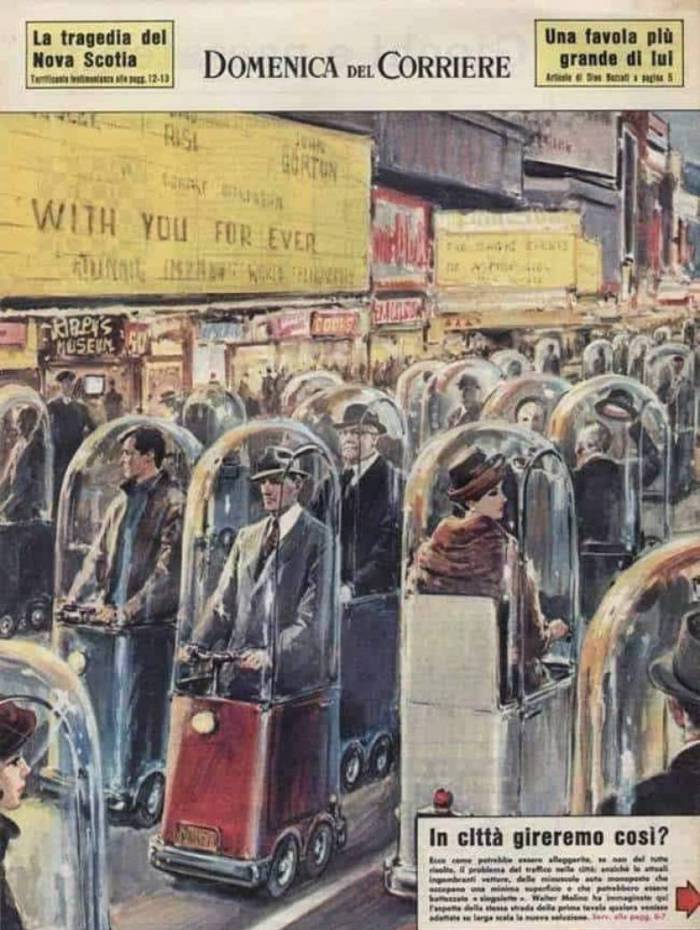 Em resumo, a imagem com pessoas se deslocando em veículos de apenas um lugar corresponde à contracapa da revista Domenica del Corriere de 16 de dezembro de 1962; no entanto, não havia menção ao ano 2022, nem constitui uma previsão, mas mostra uma proposta futurista para aliviar o tráfego nas cidades.