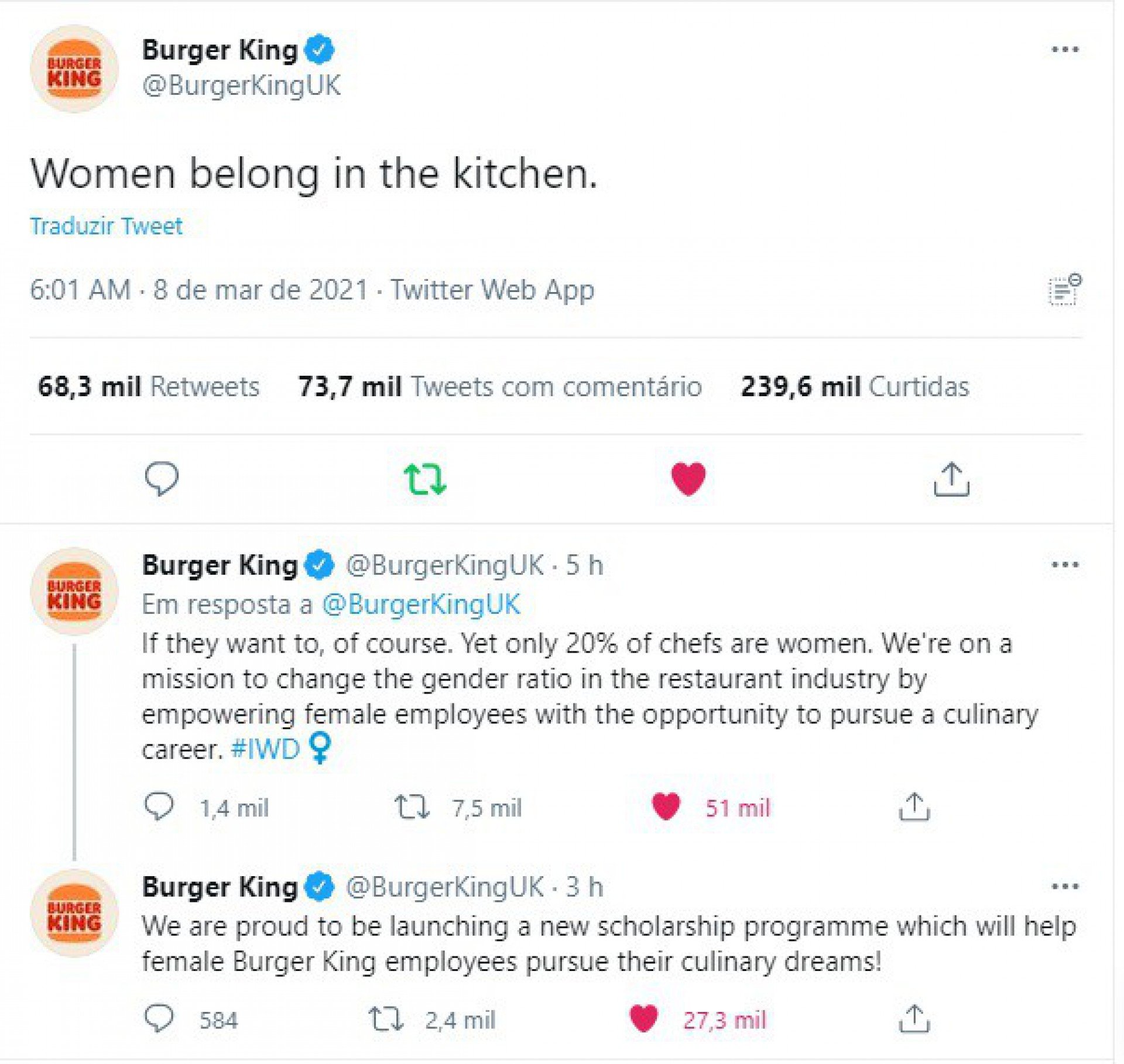 A ação foi uma tentativa de chamar atenção para outra proposta. O restaurante queria ressaltar o fato que apenas 20% das chefs profissionais de cozinha do país eram mulheres. E usou essa primeira publicação em um ‘fio’ (uma sequência de publicações típica do Twitter) para conseguir visibilidade rápida.