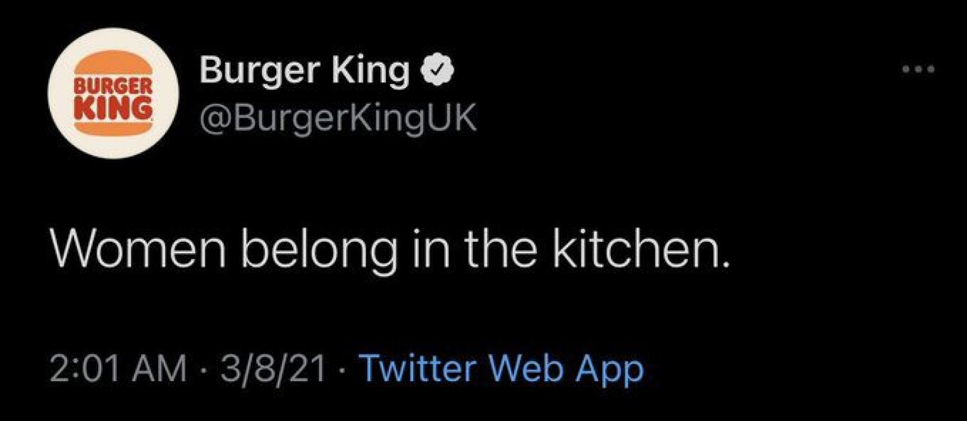Rio – O Burger King aproveitou o Dia Internacional da Mulher para fazer uma jogada arriscada. Pelo Twitter, o perfil do fast-food no Reino Unido publicou a mensagem ‘Women belong in the kitchen’, que pode ser traduzido para o português como a expressão machista ‘lugar de mulher é na cozinha’.