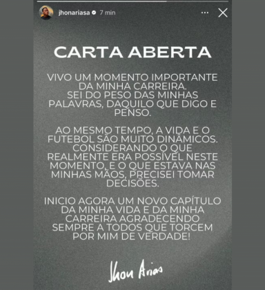 Pouco antes de ser anunciado como novo reforço do Palmeiras, Jhon Arias tratou de fechar um capítulo importante da carreira. Na manhã deste sábado (7), o colombiano publicou uma carta aberta para ...